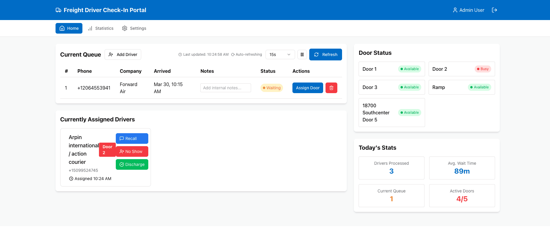 Eliminate phone calls and clipboard check-ins with our automated driver queue management system. Communicate with freight drivers in their trucks and assign doors via text message.